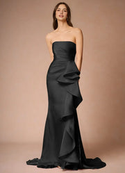 This rich trumpet prom dress features a strapless neck, sleeveless design, and a low back. The train-length smooth fabric silhouette with ruffle accents adds lush allure, ideal for prom events.