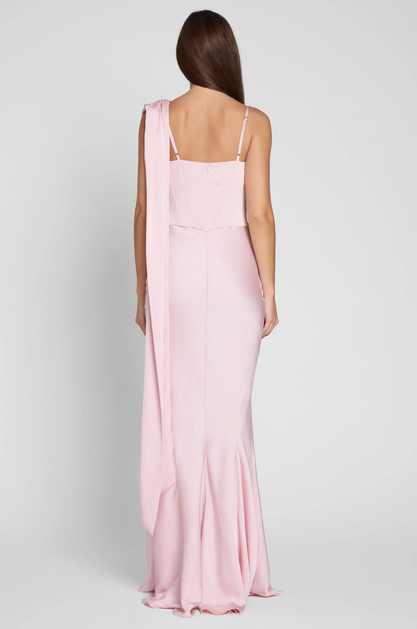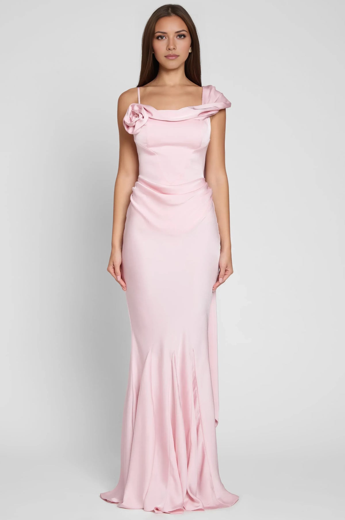 This prom dress features a mermaid silhouette. It has an asymmetric neckline with sleeveless design. The floral-accent and draped detailing add romantic charm, and the floor-length cut is perfect for prom events. Satin-like fabric with sculpted draping creates a romantic and sophisticated prom look.