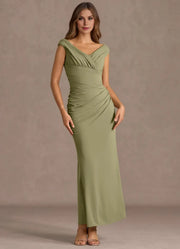 This prom dress features a sheath silhouette with stretch fabric for a form-fitting, comfortable look. The off-shoulder neckline adds a distinct soft touch, while the all-over ruching brings subtle texture. The V-back and midi length suit semi-formal settings, making it ideal for prom events keeping the wearer confident and eye-catching.