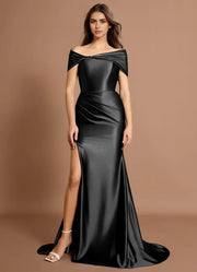 Ruched Shoulder Mermaid Satin Off The Shoulder Train Back Floor Length Hot sale Prom Dress