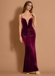 This prom dress features a mermaid silhouette with velvet fabric, fitting closely to highlight curves. The sweetheart neckline ruched detail add a distinct soft touch, while the spaghetti straps bring delicate charm. The floor length suits formal settings, making it ideal for prom events keeping the wearer confident and eye-catching.
