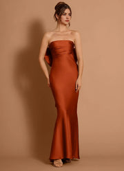 This prom dress features a mermaid silhouette with a sleek satin fabric, fitting closely to highlight curves. The strapless neckline adds a distinct graceful touch, while the large bow-back + layered ruffles bring eye-catching detail. The smooth material ensures a polished look, making it ideal for prom keeping the wearer confident and striking.