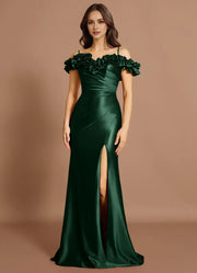 This prom dress features a mermaid silhouette with satin fabric for a lush, romantic look. The convertible shoulder (off-shoulder thin straps) adds a distinct flexible touch, while the ruffled trim brings subtle softness. The train and high slit boost movement, making it ideal for prom events keeping the wearer confident and eye-catching.