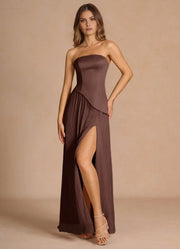 This prom dress features an A-line silhouette with mixed fabric textures (smooth bodice pleated skirt) for a layered, elegant look. The strapless neckline (with sash shoulder detail) adds a distinct graceful touch, while the open back brings subtle allure. The high slit boosts movement, making it ideal for prom events keeping the wearer confident and eye-catching.