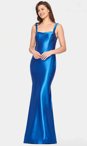 elegant floor-length prom dress features a scoop neckline and sleeveless, Strappy Open Back, Ruched, Back Zipper, off-the-shoulder design that enhances your silhouette with a classic mermaid cut. Crafted in a timeless blue shade, it combines sophistication and style, perfect for making a memorable impression at formal events. Tailored to flatter the figure, this dress offers both comfort and elegance for a confident, graceful look.