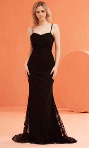 modern black prom dress features a sophisticated off-the-shoulder neckline and a sleek scoop sleeveless design that beautifully frames the shoulders. Its floor-length sheath silhouette offers a flattering, Spaghetti Straps, Lace-Up Back,streamlined fit perfect for formal occasions. Crafted for elegance and comfort, this dress is ideal for women seeking a timeless yet contemporary look for prom or special events.