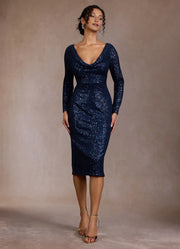 This prom dress features a sheath silhouette with full sequins, creating a luminous, form-fitting look. The deep V-neck draped detail add a distinct soft touch, while the long sleeves bring polished charm. The midi length ensures versatility, making it ideal for prom events keeping the wearer confident and eye-catching.