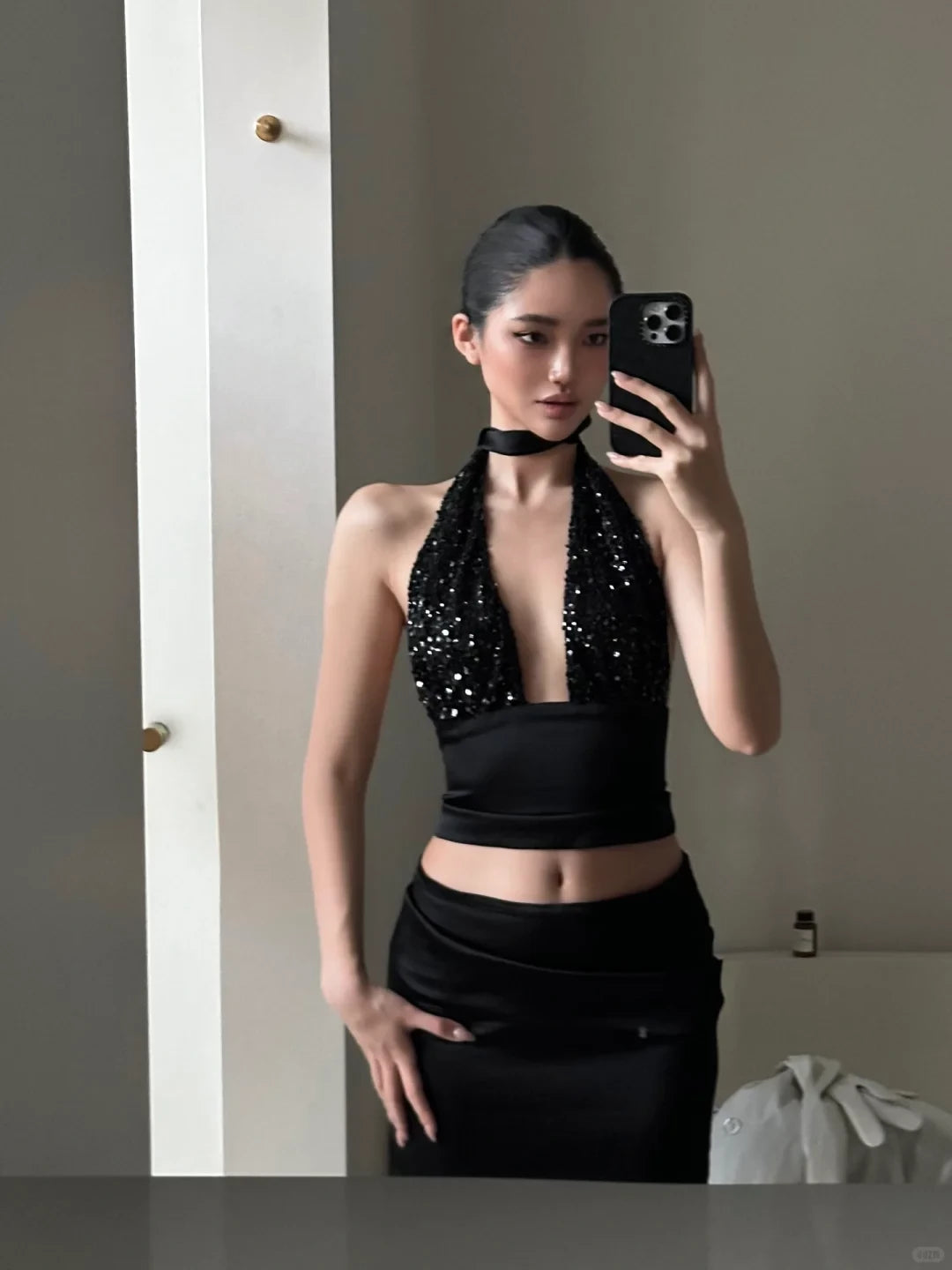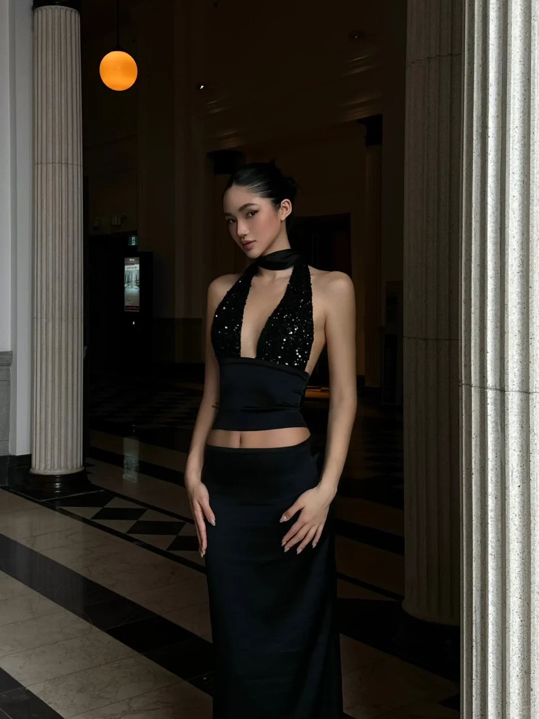 Sexy Two Piece Sheath Halter Black Sequin Satin Floor length Sleeveless Off-the-shoulder Prom Dress Cocktail Dress Homecoming Dress Evening Dress