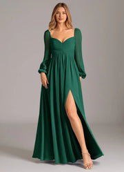 This prom dress features an A line silhouette with chiffon fabric for a light, elegant look. The sheer-sleeve square neck adds a distinct graceful touch, while the ruched bodice brings subtle texture. The high slit boosts movement, making it ideal for prom events keeping the wearer confident and eye-catching.
