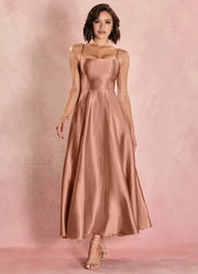 This silky fit-and-flare prom dress features a square neck, sleeveless design, and a lace-up back. The midi-length satin silhouette adds flowing volume, ideal for prom events.