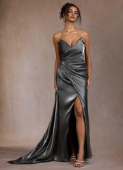 This prom dress features a sheath silhouette with glossy fabric for a figure-hugging, smooth fit. The off-shoulder neckline adds a distinct, draped touch, while the sleeveless style keeps it balanced. The open-back detail brings subtle allure, and the train-length skirt balances sleekness and drama ideal for prom events, helping the wearer feel confident and striking.