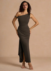This sleek sheath prom dress features a one-shoulder neck, sleeveless design, and an open back. The floor-length draped fabric silhouette with a side slit adds subtle movement, ideal for prom events.