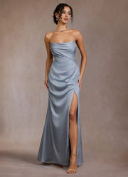 This prom dress has a sheath silhouette with smooth, draped fabric for a figure-hugging, polished fit. The strapless neckline adds a clean, distinct touch, while the sleeveless style keeps it light. The lace-up-back detail brings subtle allure, and the floor-length skirt with a high slit balances sleekness and movement ideal for prom events, helping the wearer feel confident and put-together.