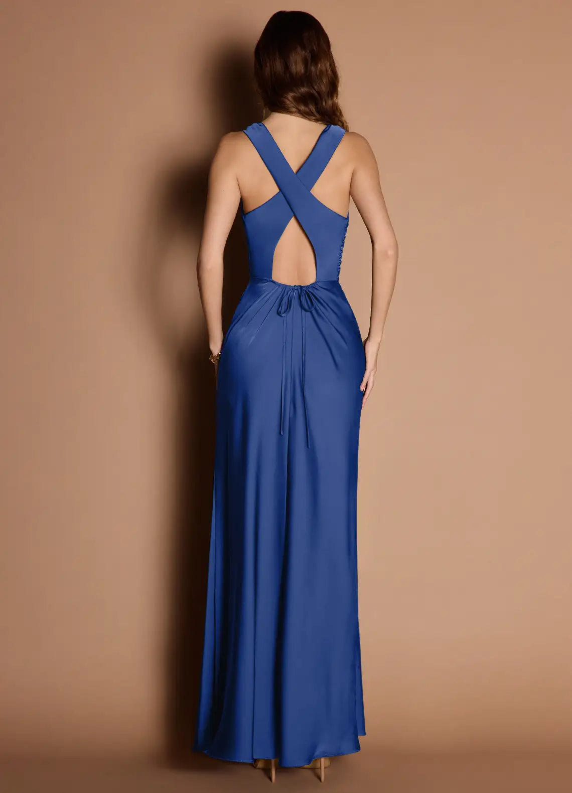 This sleek trumpet prom dress features a boat neck, sleeveless design, and a crisscross back. The floor-length satin fabric silhouette with a keyhole cutout adds sharp allure, ideal for prom events.