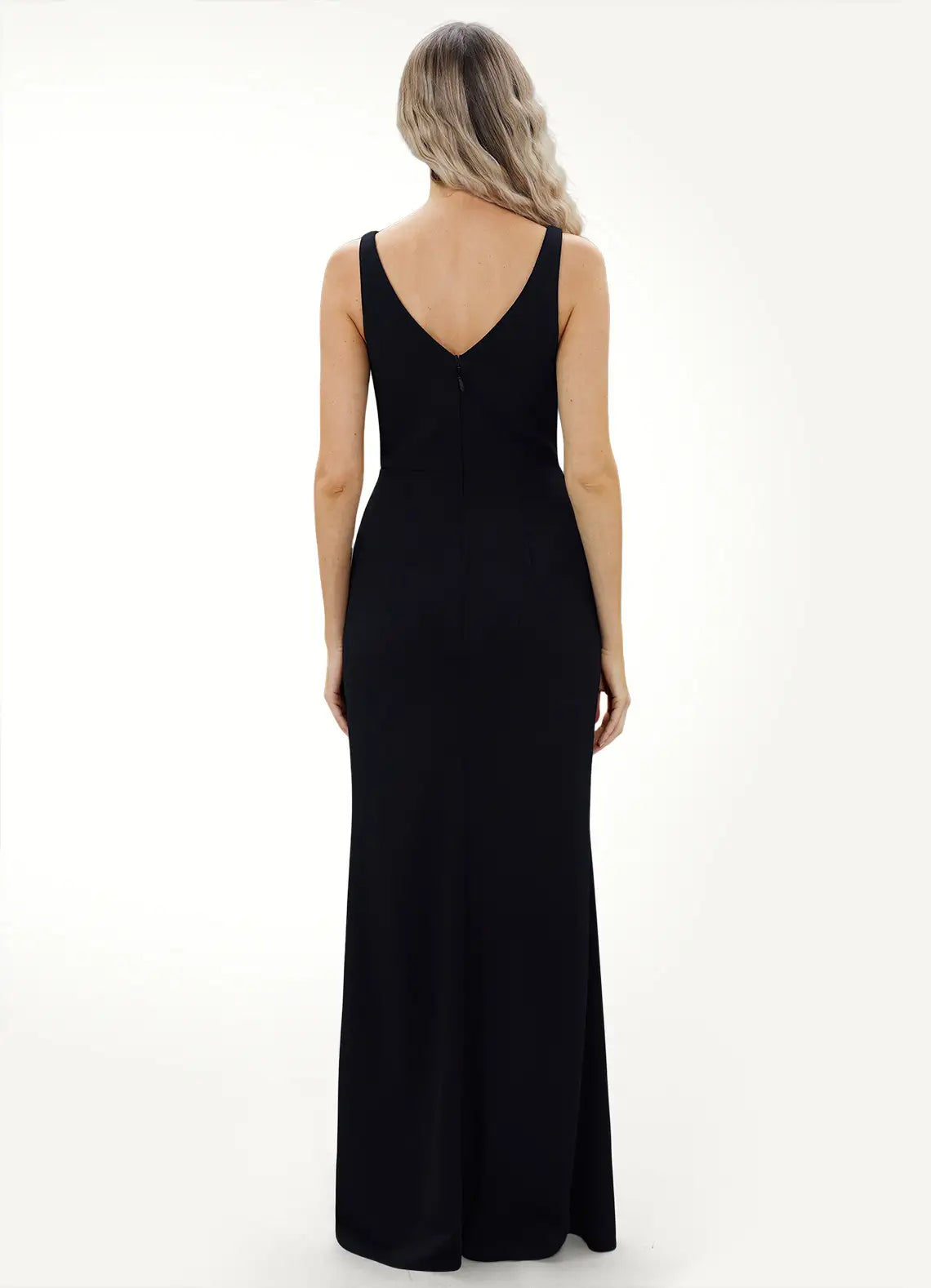This sleek trumpet prom dress features a deep V-neck, sleeveless design, and a V-back. The floor-length structured fabric silhouette with side slit adds sharp allure, ideal for prom events.