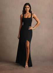 This sleek trumpet prom dress features a square neck, sleeveless design, and an open back. The floor-length structured fabric silhouette with side slit adds sharp allure, ideal for prom events.