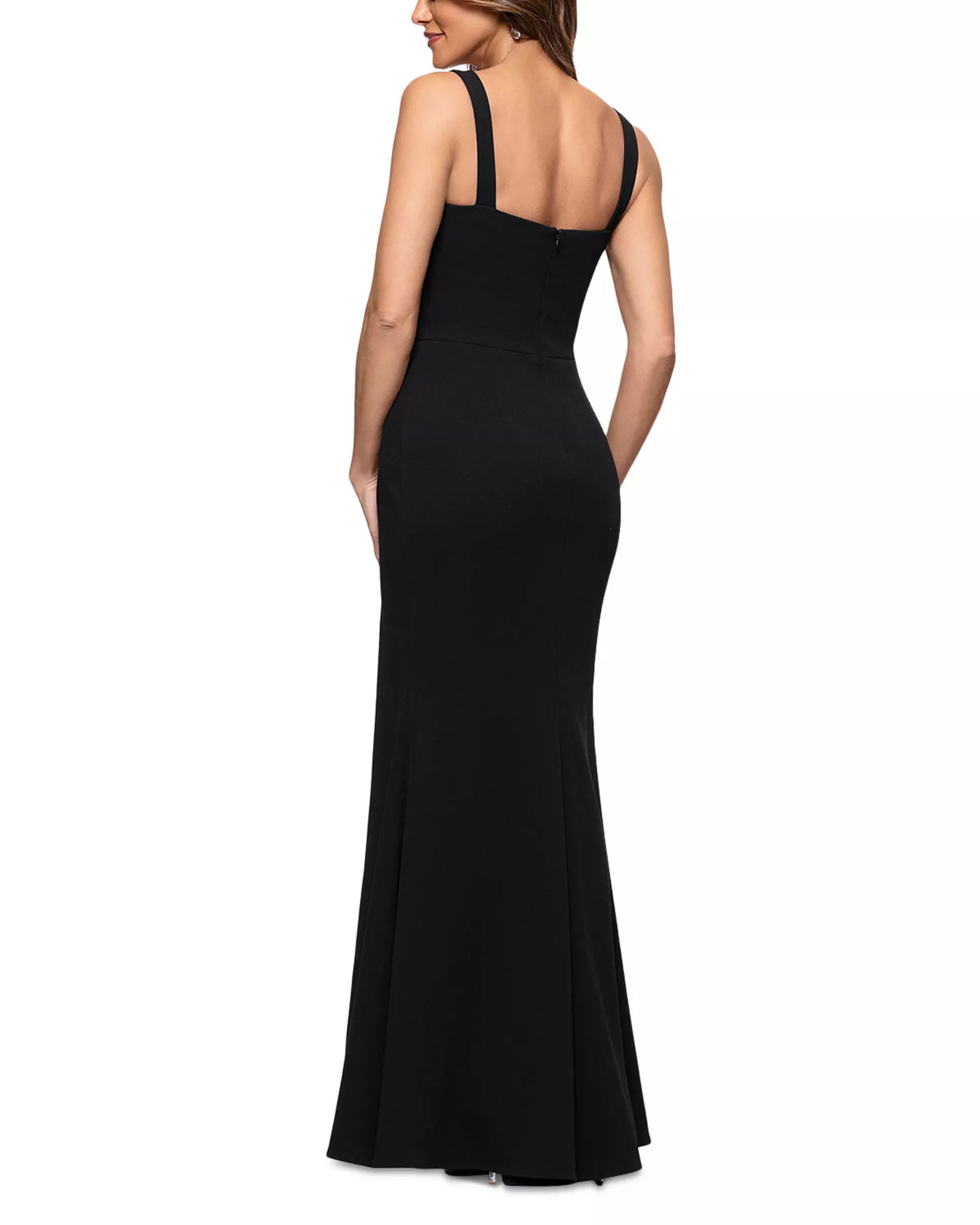This sleek trumpet prom dress features a square neck, spaghetti straps, and a zipper back. The floor-length stretch fabric with side slit adds subtle allure, ideal for prom events.