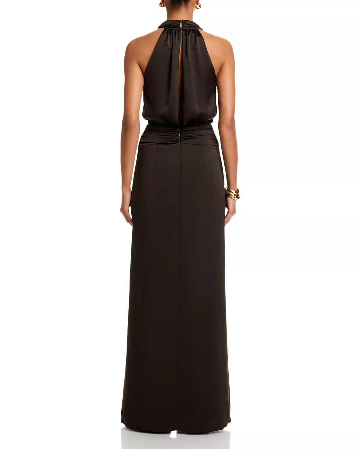 This smooth column prom dress features a halter neck, sleeveless design, and a keyhole back. The floor-length sleek fabric silhouette with side slit & gathered waist adds understated allure, ideal for prom events.