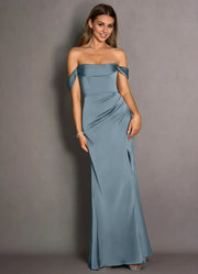 This smooth mermaid prom dress features an off-the-shoulder neck, sleeveless design, and an open back. The floor-length satin fabric silhouette with a high side slit adds soft sophistication, ideal for prom events.