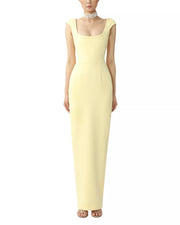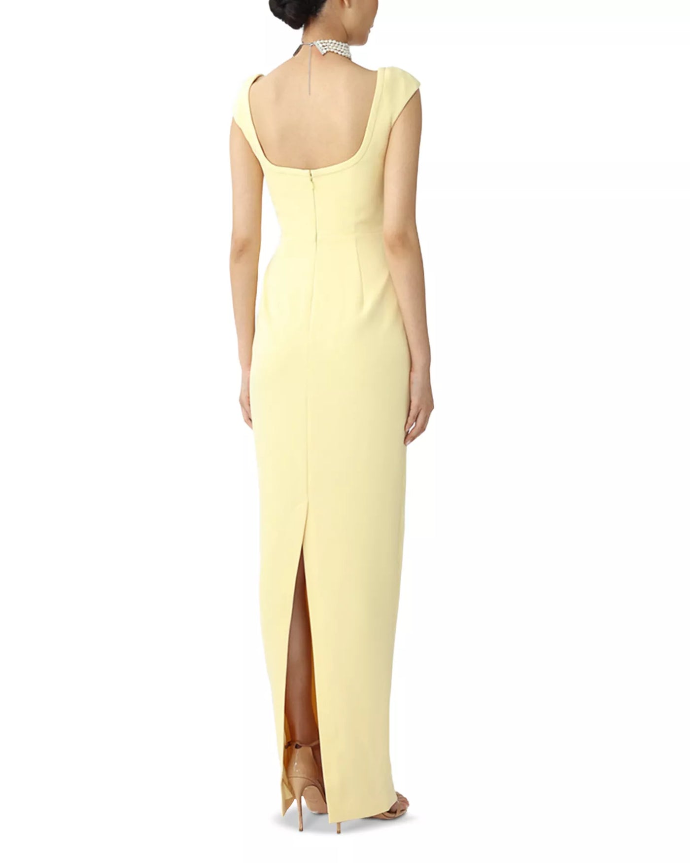 This smooth sheath prom dress features a square neck, cap sleeves, and an open back. The floor-length structured fabric silhouette with back slit accents adds subtle allure, ideal for prom events.