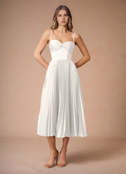 This soft A-line prom dress features a sweetheart neck, sleeveless design, and an open back. The midi-length fabric silhouette with pleated skirt & twist bust accents adds gentle charm, ideal for prom events.