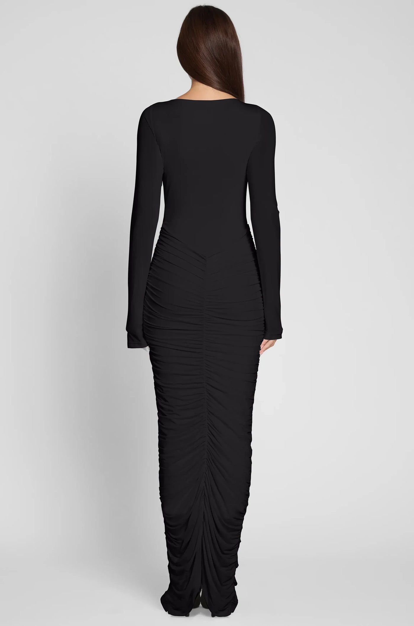 Sophisticated Sheath Boat Neck Long Sleeve Ruched Bodice Floor Length Prom Dress