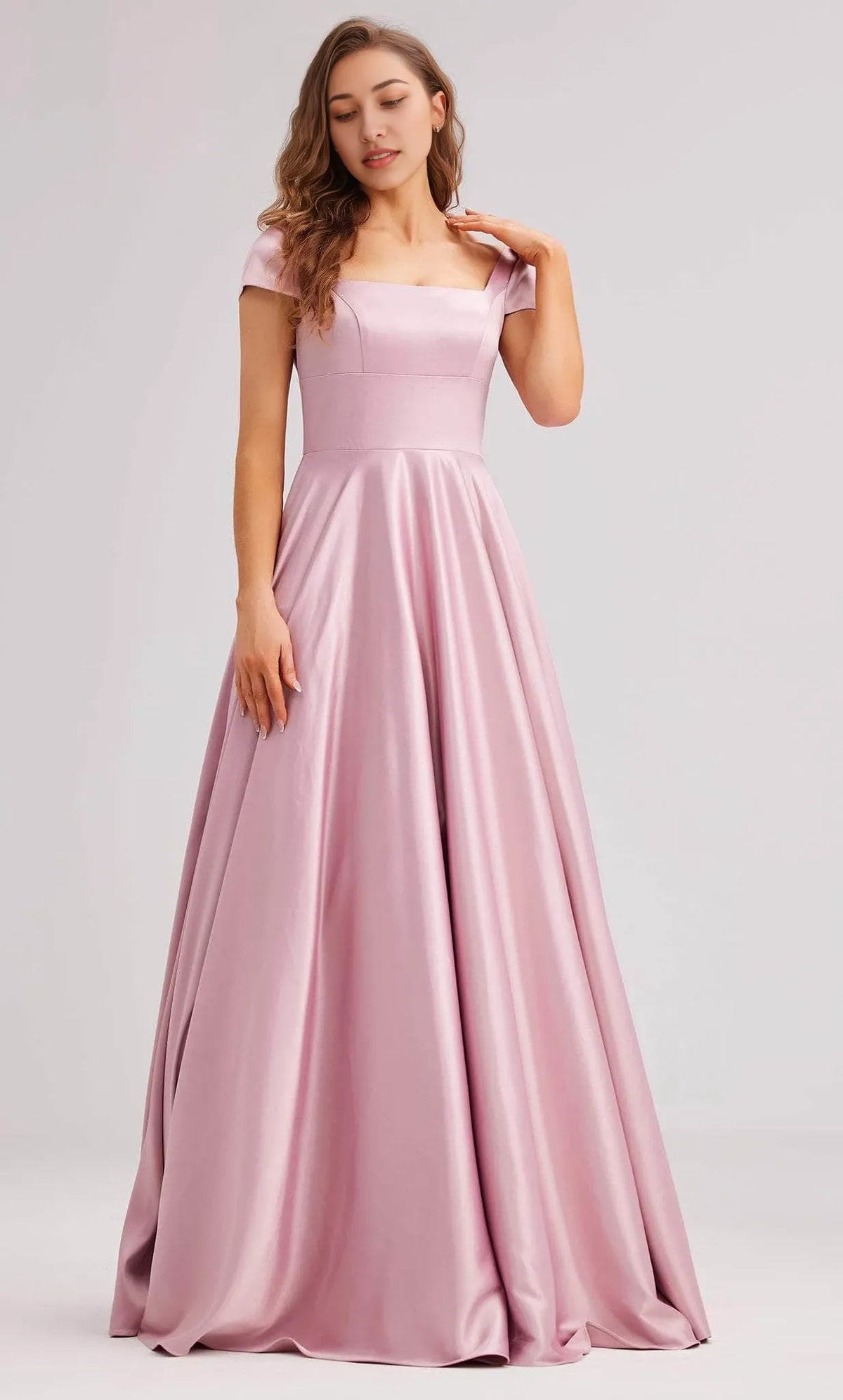 floor-length prom dress features a flattering A-line silhouette and trendy off-the-shoulder design, V-Open Back, Zipper Closure, Pockets,enhanced by elegant square short sleeves. Crafted to offer both style and comfort, it’s an ideal choice for special occasions where sophistication and a modern touch are desired. The dress’s timeless shape ensures ease of movement while making a striking impression for any formal event.