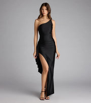 This striking dress features a high low silhouette, with a shorter front and flowing back for a bold and eye catching look. The one shoulder design adds a touch of chic allure. With a sleeveless cut, it keeps a sleek and modern style. The open back detail ensures a lovely and seamless fit, making for a truly striking and unforgettable appearance, perfect for prom events.