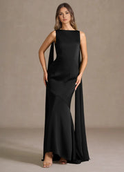 This satin mermaid prom dress features a boat neckline, sleeveless design with flowing fabric accents, and a tie-back open back. The floor-length silhouette offers a sleek fit, ideal for formal prom events.