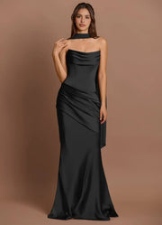 This satin mermaid prom dress features a sweetheart neckline, halter drape design, and a lace-up open back. The floor-length silhouette has layered accents, ideal for formal prom events.