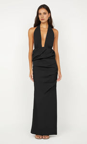 This evening dress has a sheath silhouette for a figure-hugging, sharp fit. The halter-neck design brings a striking, bold touch, while the sleeveless style keeps it sleek. The open-back detail adds allure, and the floor-length fit makes it ideal for evening events helping the wearer feel confident and memorable.