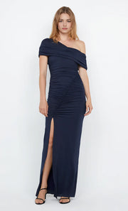 This evening dress has a sheath silhouette for a figure-hugging, tailored fit. The one-shoulder design with draped detail adds a distinct, polished touch, while the short-sleeve style keeps it balanced. The open-back detail brings subtle allure, and the floor-length cut with a side slit balances structure and ease ideal for evening events, helping the wearer feel confident and composed.