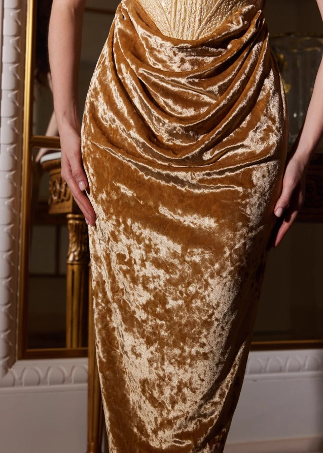 Stunning Pearl Golden Sheath Satin Velvet Sleeveless Off-the-shoulder Floor length Prom Dress Cocktail Dress Homecoming Dress Evening Dress