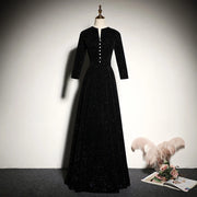 This elegant black velvet evening dress features long sleeves and a lace-up design, creating a flattering silhouette. Its floor-length cut adds sophistication, making it an ideal choice for formal events, parties, and proms. The luxurious velvet fabric ensures comfort and style throughout the evening.