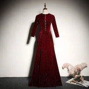 This elegant floor-length evening dress features a rich red velvet fabric combined with long sleeves and a sophisticated lace-up design. Perfect for formal events, prom, or parties, it offers a flattering silhouette that enhances your presence with timeless style and comfort. The intricate lace-up detail adds a modern touch while ensuring a customizable fit. Ideal for those seeking a blend of classic elegance and contemporary fashion.