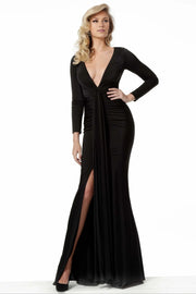 refined prom dress showcases a classic sheath silhouette with a deep V-neck and elegant long sleeves for added sophistication. The off-the-shoulder design highlights your neckline while maintaining a timeless appeal. Its floor-length cut ensures a graceful presence, High slit, Ruching,making it an ideal choice for formal occasions where style and poise are paramount.