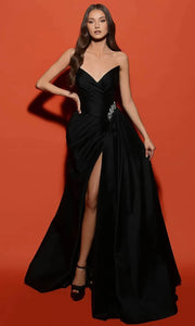 black prom dress combines modern elegance with timeless style. Featuring a sleek sheath silhouette, High Slit, Side Sash, Midrise Back,it offers a flattering floor-length fit that enhances the wearer’s form. The sleeveless design and trendy off-the-shoulder neckline create a sophisticated V-neck shape, perfect for formal occasions. Crafted to balance contemporary fashion with classic charm, this dress is an excellent choice for women seeking a statement look at prom or special events.