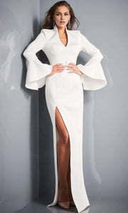 floor-length sheath prom dress features a sophisticated V-neckline and long sleeves, offering elegant coverage with a flattering silhouette. High leg slit Bell style long sleeve Designed for formal occasions, it combines classic style with a streamlined fit, enhancing confidence and poise at any event. Crafted to ensure comfort throughout the evening, this dress is an excellent choice for women seeking timeless elegance for special occasions.