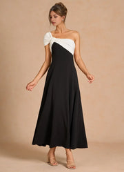 This vibrant fit-and-flare prom dress features a one-shoulder neck, sleeveless design, and an open back. The midi-length two-tone fabric silhouette with a bow accent adds bold charm, ideal for prom events.
