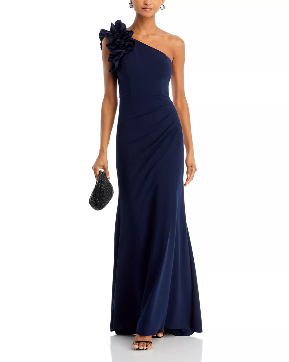 This vibrant mermaid prom dress features a one-shoulder neck, sleeveless design, and a ruched back. The floor-length silhouette with a floral shoulder accent adds playful texture, ideal for prom events.