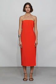 This vibrant shift prom dress features a strapless neck, sleeveless design, and an open back. The midi-length structured fabric adds bold charm, ideal for prom events.