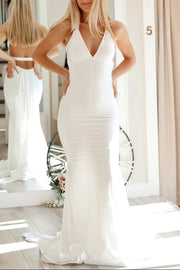 White Mermaid V-Neck Satin With Tail Sleeveless Lace Up Evening Dress Party Dresses Homecoming Dress Prom Dress