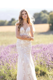 Step into a world of charm on your wedding day with this captivating trumpet dress. The plunging V neckline adds a touch of allure, and the spaghetti straps keep it delicate. The open back style brings a romantic flair, while the floor length skirt flows beautifully, making it perfect for your special celebration.