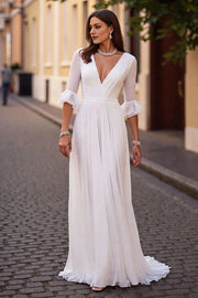Chic A Line Deep V Neck Bell Sleeve V Back Floor Length Wedding Dress