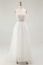 stylish dress features an A line silhouette, offering a flowing and graceful look. The deep V neckline exudes chic charm, while the sleeveless design keeps it sleek and modern. The open back adds a touch of alluring sophistication, and the floor length skirt, with its soft tulle fabric and beautiful lace detailing on the bodice, creates a truly chic and unforgettable style, perfect for a wedding ceremony.
