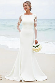 stylish dress features a mermaid silhouette that beautifully hugs the curves. The boat neck design exudes a classic charm, while the lace long sleeves bring an elegant and intricate vibe. The illusion back, adorned with delicate lace, creates a captivating and refined look, and the floor length skirt, with its smooth fabric, makes for a truly chic and memorable appearance, perfect for a wedding ceremony.