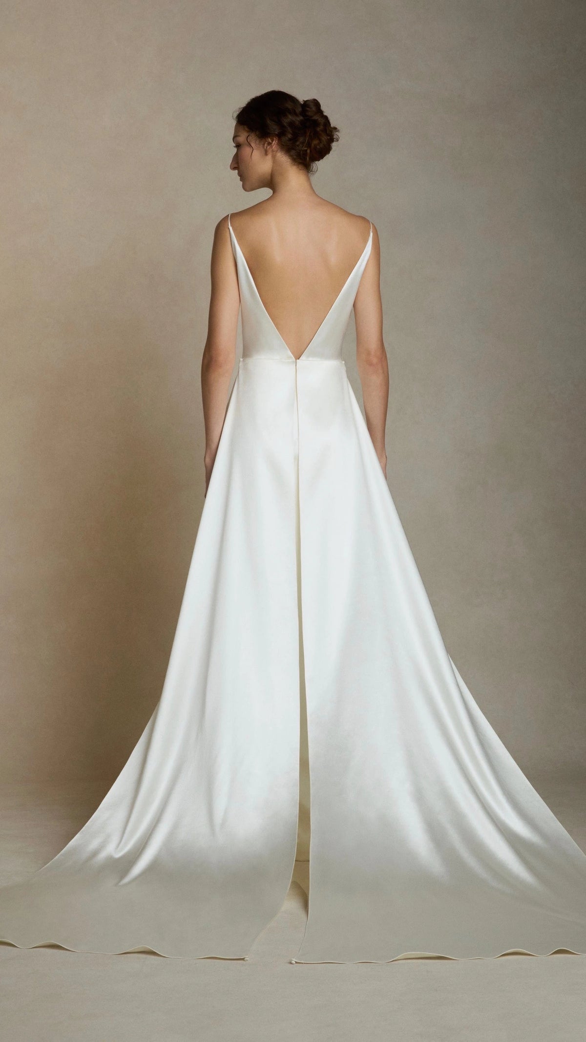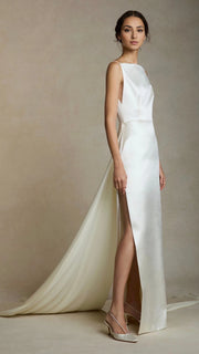 This stylish dress features a sheath silhouette that hugs the body for a sleek and elegant look. The boat neck design exudes chic charm, while the sleeveless style keeps it airy and modern. The open back creates an alluring and graceful appearance, and the floor length skirt, with its smooth satin fabric and beautiful drape, makes for a truly chic and memorable style, perfect for a wedding ceremony.