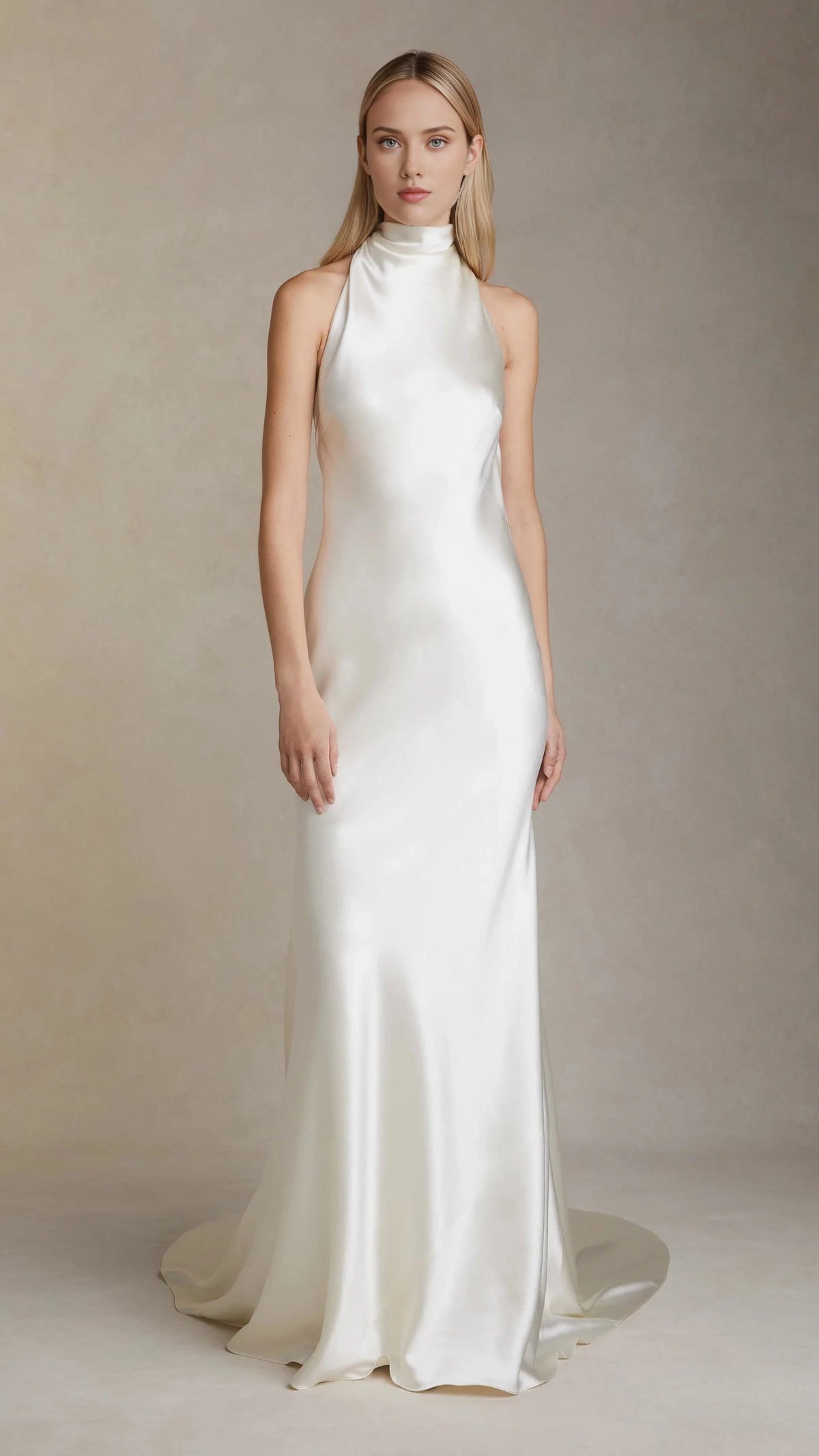 This stylish dress features a sheath silhouette that hugs the body for a sleek and elegant look. The halter neck design exudes chic charm, while the sleeveless style keeps it airy and modern. The tie back creates an alluring and graceful appearance, and the floor length skirt, with its smooth satin fabric and beautiful drape, makes for a truly chic and memorable style, perfect for a wedding ceremony.
