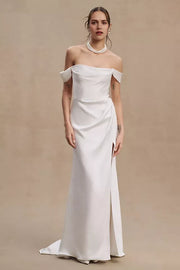 stylish dress features a sheath silhouette, offering a sleek and form - fitting look. The off shoulder neckline exudes chic charm, while the flutter sleeves add a touch of delicate allure. The button back brings timeless sophistication, and the floor length skirt, with its smooth fabric and elegant slit, creates a truly chic and unforgettable style, perfect for a wedding ceremony.