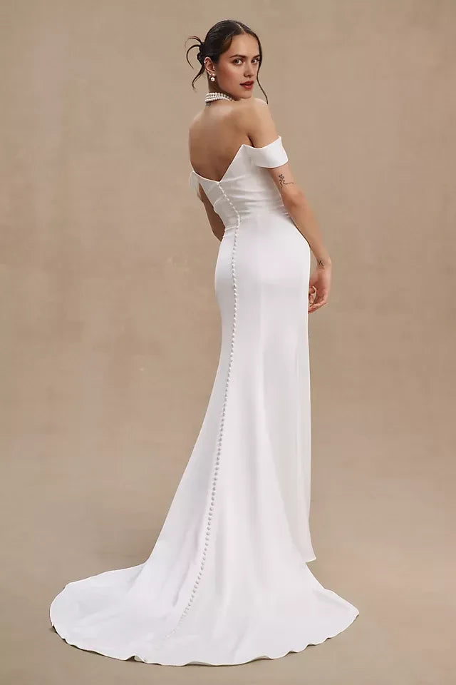 Chic Sheath Off Shoulder Flutter Sleeve Button Back Wedding Dress occasion: Bridal showers Red carpet events Upscale parties Masquerade balls Formal corporate events White tie events Female guests
